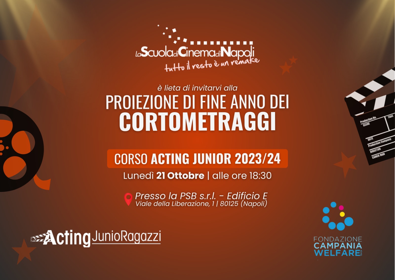Lunedì 21 ottobre 2024, alle ore 18.30, presso il Parco San Laise, in Napoli al Viale della Liberazione n. 1, si terrà l'evento conclusivo di fine anno con la proiezione dei cortometraggi prodotti nell'ambito del Corso Acting Junior 2023/2024