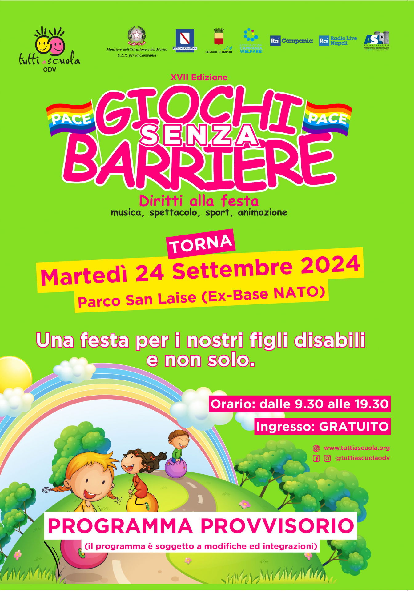L’evento è in programma il 24 settembre dalle 9.30 alle 19.30, nella piazza centrale del Parco San Laise, ed è come ogni anno a ingresso gratuito. Una festa per i bambini disabili e non solo, che sarà resa possibile grazie al coinvolgimento di oltre 400 volontari, con i patrocini del Ministero dell’Istruzione e del Merito U.S.R. per la Campania, Regione Campania, Comune di Napoli, Fondazione Campania Welfare, Rai Campania, Radio Live Napoli e Asl Napoli 1.