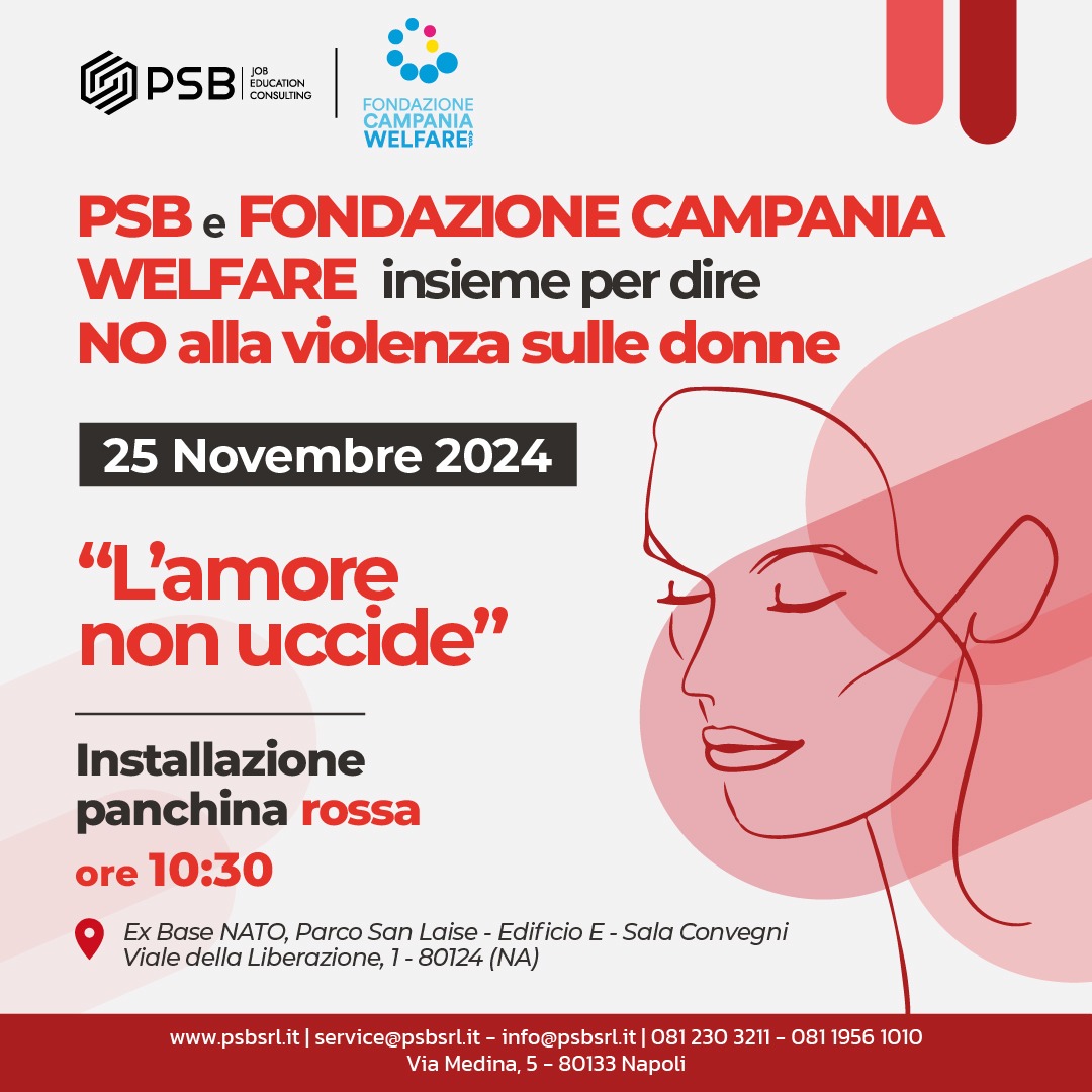 Lunedì 25 novembre 2024, in occasione della Giornata internazionale per l'eliminazione della violenza contro le donne, la Fondazione Campania Welfare insieme a PSB, presso gli spazi esterni del Parco San Laise, provvederà all'istallazione di una panchina rossa, simbolo del contrasto alla violenza alle donne, emblema del posto occupato da una donna uccisa da un uomo in quanto donna, segno tangibile di una mancanza causata dalla violenza, stimolo a un confronto e a una riflessione sulla violenza e sui cambiamenti culturali necessari per sconfiggerla.