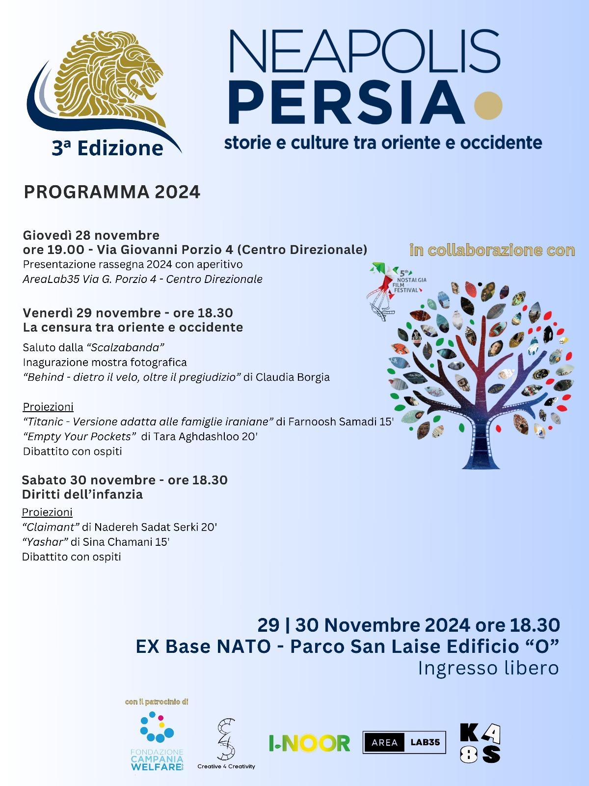 La terza edizione dell'evento denominato "Neapolis Persia - storie e culture tra oriente e occidente", patrocinato dalla Fondazione Campania Welfare si svolgerà nei giorno 29 e 30 novembre dalle ore 18:30, presso l'ed. O del Parco San Laise. L'ingresso è gratuito.