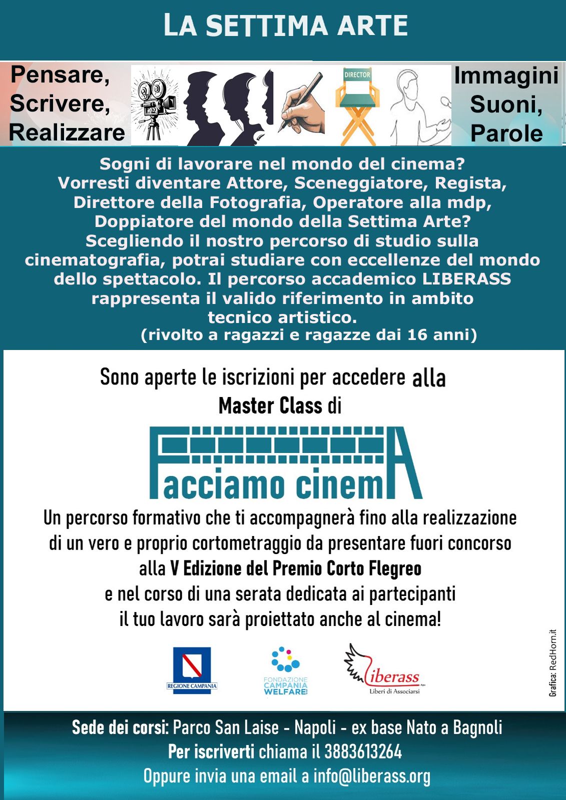 Sono aperte le iscrizioni per la master class di Facciamo cinema. Un percorso formativo che ti accompagnerà alla realizzazione di un vero e proprio cortometraggio da presentare fuori concorso alla V Edizione del Premio Corto Flegreo e nel corso della serata dedicata ai partecipanti il tuo lavoro sarà proiettato anche al cinema in collaborazione con l'associazione Liberass APS.