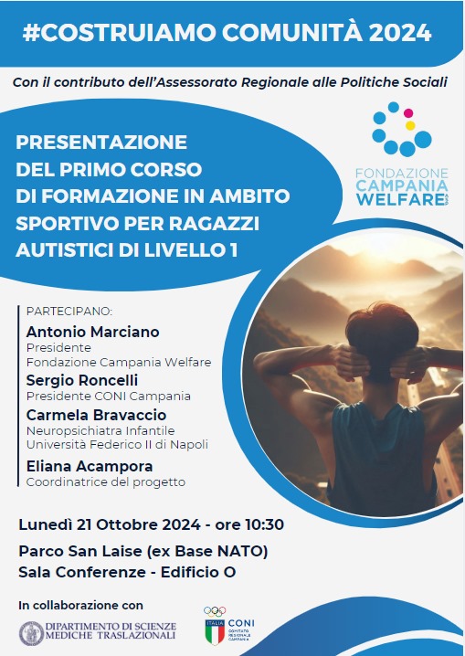 Lunedì 21 ottobre 2024, alle ore 10.30, presso la Sala Conferenze dell'Edificio "O" ubicato nel Parco San Laise, in Napoli al Viale della Liberazione n. 1, si terrà la presentazione del "Primo corso di formazione in ambito sportivo per ragazzi autistici" promosso dalla Fondazione Campania Welfare Asp in collaborazione con il Dipartimento di Scienze Mediche Traslazionali dell'Università Federico II ed il CONI Comitato Regionale Campania, con il contributo dell'Assessorato alle Politiche Sociali della Regione Campania.